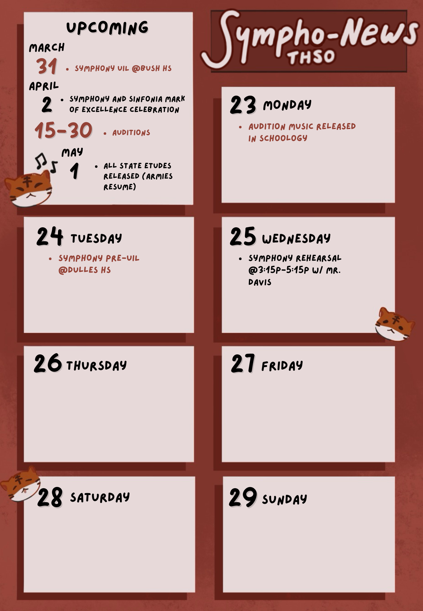 On Tuesday, March 24th, Symphony will have their Pre-UIL concert at Dulles High School at 6:30p. Call time for Symphony is 5:45p.